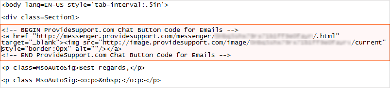 <body lang=EN-US link=blue vlink=purple style=’tab-interval:.5in’><div class=Section1> 最初の署名の HTML 書式を考慮しながら、チャットボタンを表示したい場所にコードを追加してください。